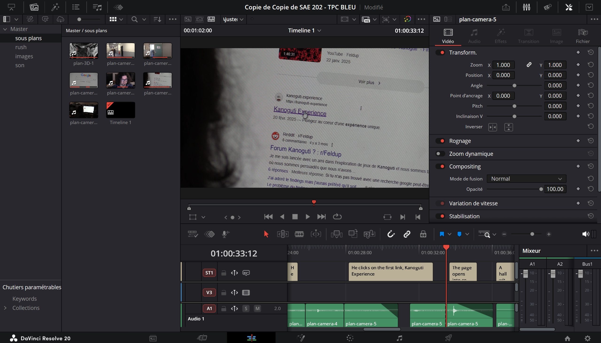 Enfin, la partie sur laquelle j'ai pour le coup vraiment tout donné : la vidéo promotionnelle. Elle était obligatoire et devait durer environ 1 minute. J'ai été chargé d'à peu près tout, c'est à dire que je me suis occupé du scénario, de la réalisation, du cadrage, du montage, et même de la 3D. J'ai fait le montage sur DaVinci Resolve, et la 3D sur Blender. C'était absolument facultatif, mais comme on proposait une exposition immersive, je m'étais dit que l'on aurait quand même besoin de visuels, même basiques, pour la vidéo. Je n'avais jamais utilisé Blender, c'est horriblement peu intuitif, mais à force de tutoriels j'ai pu en venir à bout. Au final j'ai adoré faire cette vidéo, j'avais un vrai sentiment de réussite puisque c'était le point qui a été le mieux reçu de l'entièreté de nos rendus.