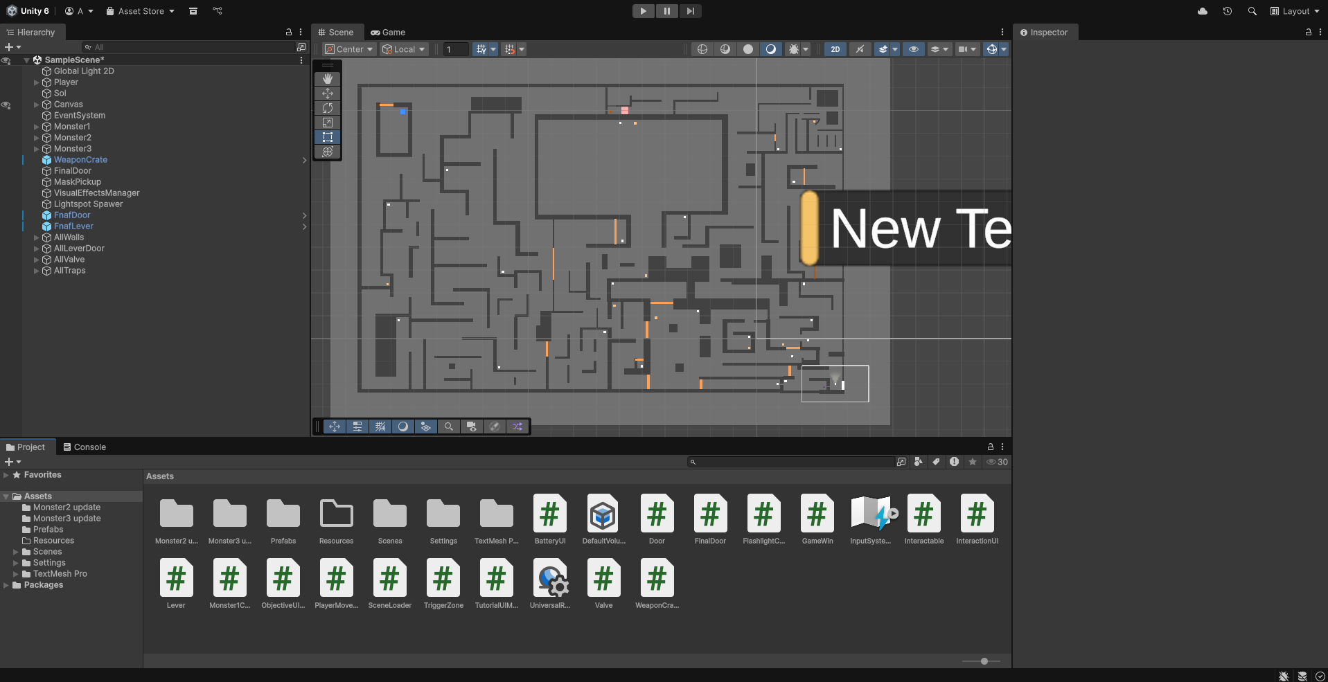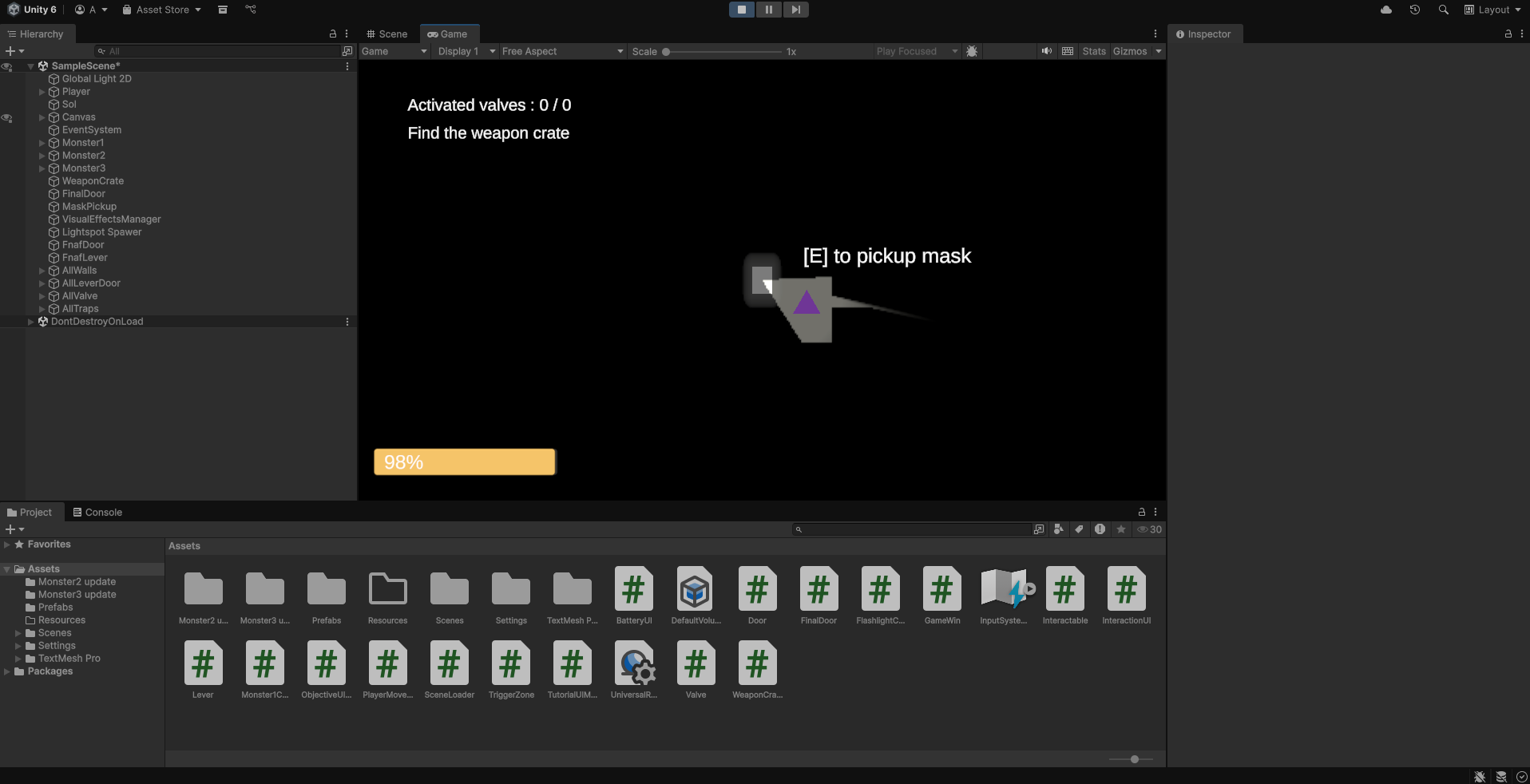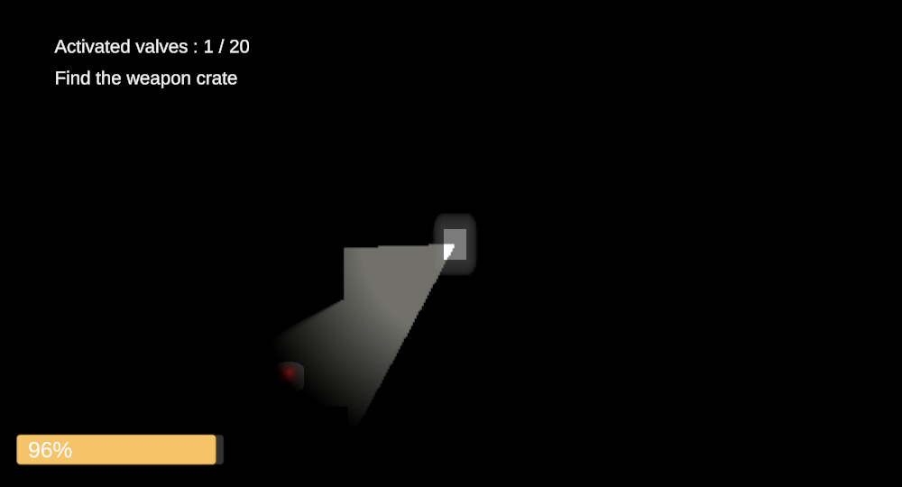 Au niveau du gameplay, le joueur peut se déplacer dans les 4 directions, et possède une lampe torche pour s’éclairer dans l’obscurité. Celle-ci a une batterie et ne peut plus s’allumer si sa batterie est à zéro. Pour ce faire, j’ai dû utiliser les systèmes de raycast et de lumières de Unity.