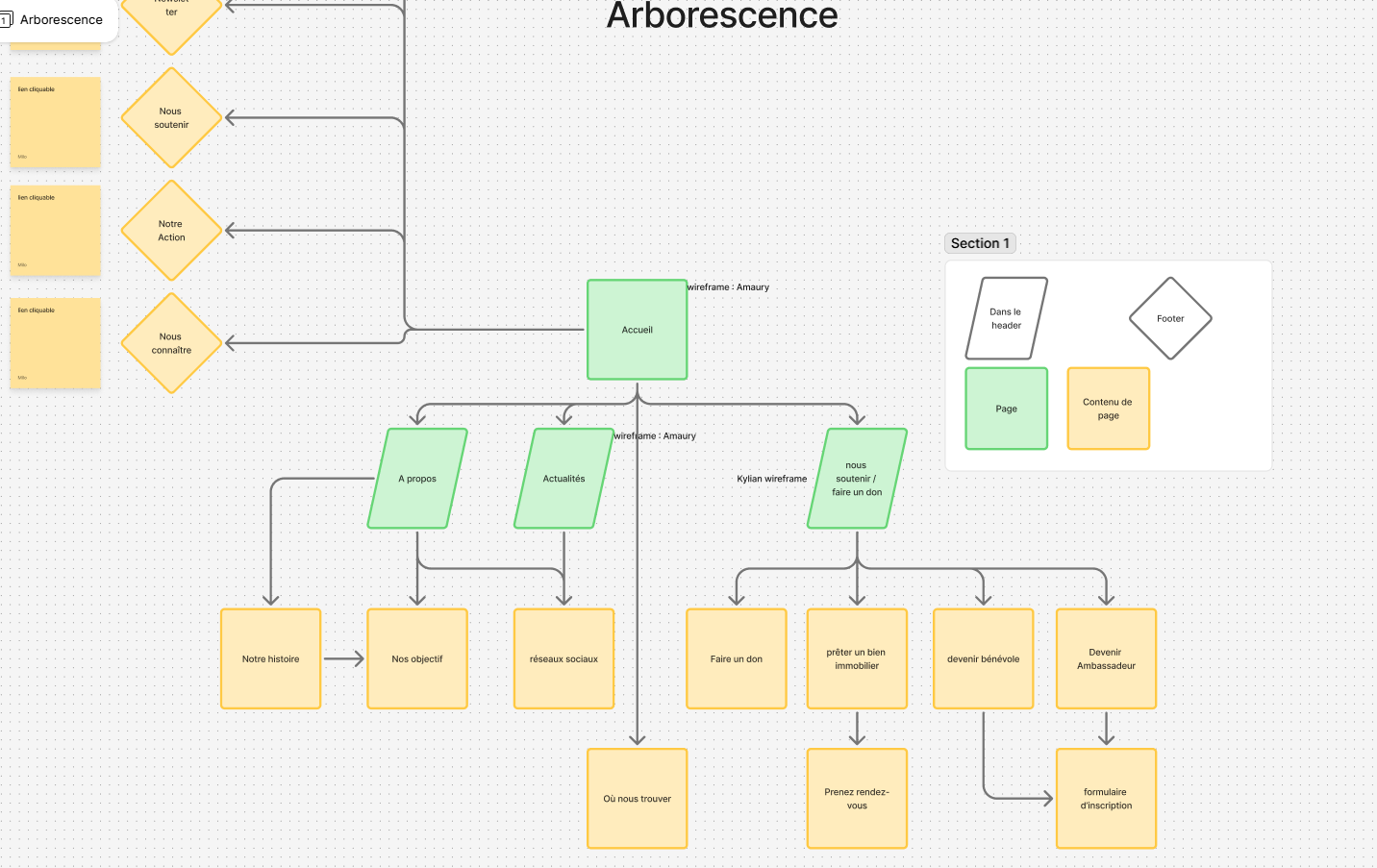 Tout d'abord, l'arborescence de notre site web. Accompagné de mes deux camarades du parcours StratUX, on a défini les pages qui seraient présentes, et une idée globale du contenu qu'on y trouverait. On a fait ça le premier jour, pour poser les bases de nos maquettes et wireframes.