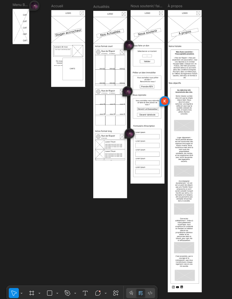 Puis j'ai coordonné le groupe StratUX pour que nous passions aux wireframes, pour permettre à l'équipe CréaNum de passer aux maquettes, ce que nous avons fait. Comme l’arborescence était déjà faite, pas besoin de réfléchir au contenu, du coup on a optimisé au mieux l’UX.