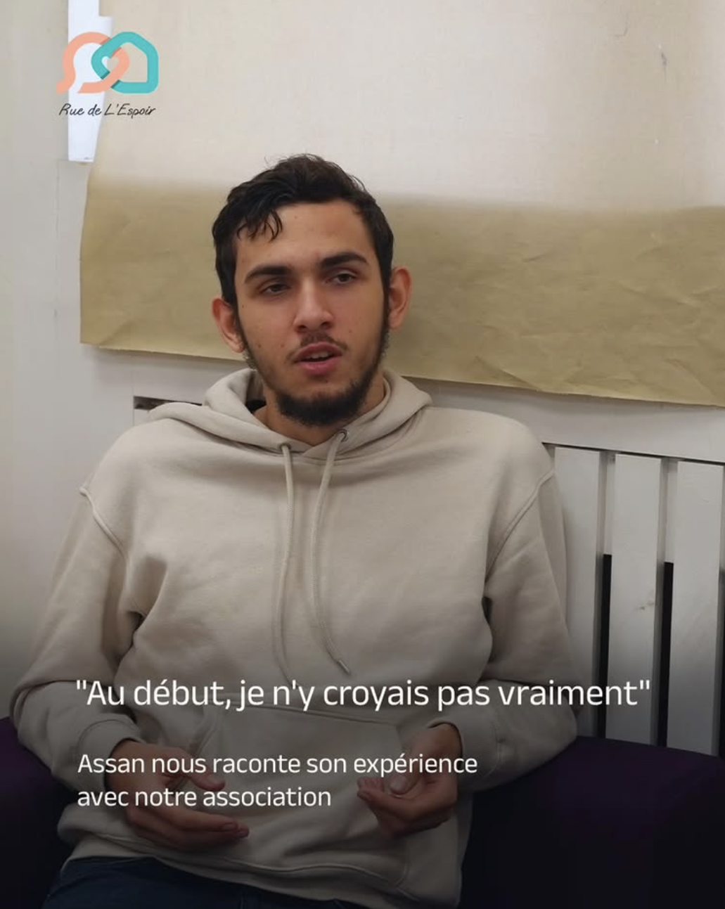 On a également dû tourner deux vidéos. J’ai écrit le scénario de l’une d’entre elles, une interview d’un ancien sans-abris aidé par Rue de l’Espoir, et ai participé au tournage en tant que caméraman. On interview dans cette vidéo Assan, ancien sans-abris, qui est devenu notre effigie pour la campagne de communication, puisqu’on le retrouve sur nos affiches, posts réseaux sociaux, vidéo informatives, et même notre site web.